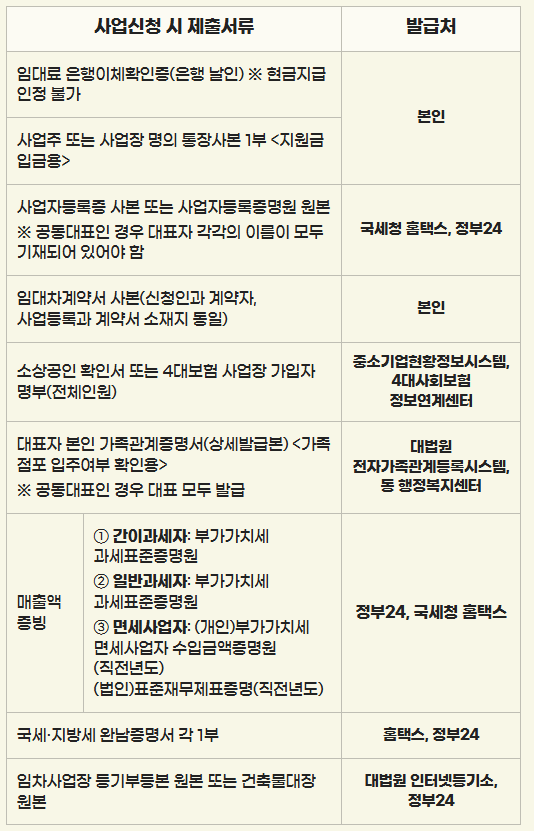 신청 시 필요한 서류는 사업자등록증, 임대차계약서, 연 매출 증빙 서류 등입니다. 자세한 내용은 공식 페이지에서 확인하시기 바랍니다.