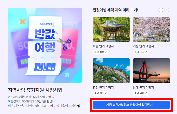 2026년 4월부터 6월까지 시행되는 '반값 여행' 지역사랑 휴가지원 사업을 통해 국내 여행 경비의 50%를 환급받으세요! 강원, 전남, 경남 등 16개 지역 신청 절차와 최대 20만 원 혜택을 상세히 정리해 드립니다.