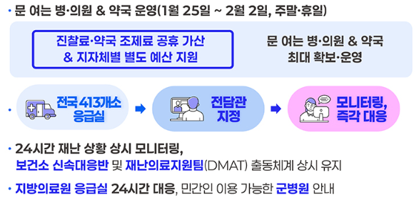 설 연휴 기간 동안 문을 여는 병원 및 약국에 대해 진찰료와 약국 조제료 공휴일 가산을 20% 추가 지급하여 당직 진료와 점검을 강화할 예정이다. 또한, 지자체별 별도 예산 지원 등을 통해 최대한 많은 병원과 의원이 운영될 수 있도록 유도할 예정이다. 전국 413개 응급 의료 기관에 전담관을 지정하여 관리하고, 보건소 당직 및 일일 보고 체계를 운영하며 중앙 및 지역 응급 상황실을 24시간 모니터링할 예정이다. 24시간 재난 상황을 상시 모니터링하고, 보건소 신속 대응반 및 재난 거점 병원(DMAT) 출동 체계를 유지할 예정이다. 지방 의료원 응급실의 24시간 대응, 의료 기관 부족 지역의 연휴 기간 보건소 및 지소 운영, 민간인 이용 가능 군 병원 홍보 등 공공 의료 기관도 적극 활용할 예정이다.
