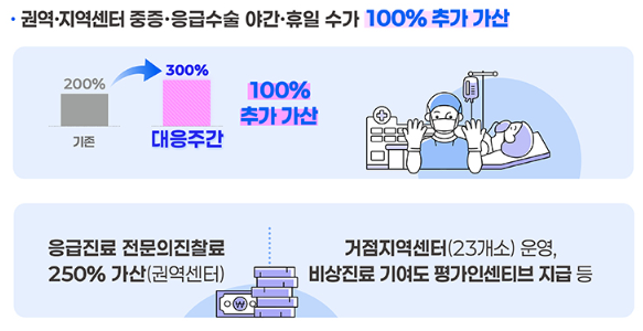 이번 조치의 일환으로 응급실과 관련 진료 역량을 강화하기 위해, 권역 및 거점 센터의 응급실 전문의 진찰료를 250% 인상하고, 응급 의료 행위에 대한 추가 지원을 지속적으로 유지할 계획이다. 또한, 중증 및 응급 환자의 진료 역량을 확보하기 위해 23개 거점 지역 센터를 운영하며, 비상 진료에 대한 기여도를 평가하고 인센티브를 지급하는 방안도 차질 없이 추진할 예정이다. 특히, 이 대응 주간 동안 중증 환자의 진료 역량 강화를 위해 181개 권역 및 지역 센터의 야간 및 휴일 중증·응급 수술 수가를 기존 200%에서 300%로 인상할 예정이다.